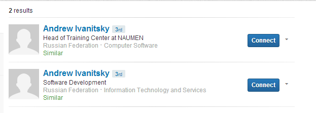 Перед тем как говорить про собственно презентацию, немного о фирме Андрея Иванитского. Как мы потом узнали эта таинственная, неназванная фирма была спонсором Московского мероприятия. Но по каким-то причинам они предпочли не называть своего имени. Но мы не привыкли играть по таким правилам, потому я попытался найти того "Андрея Иванитского", который мог бы показаться релевантным здесь. Имея достаточно обширную сеть в Linkedin я попытался найти Андрея Иванитского там, и после нескольких фальстартов увидел 2 возможных кандидата [Про размер сети сейчас сказать точно невозможно, т.к. linkedin некоторое время назад убил страницу статистики сети, но когда то они утверждали что круги 3-го порядка достигают у меня пару миллион контактов, что я расцениваю это как сеть, покрывающую большую часть российского программирования. За исключением самой дремучей его части, которые не завели себе профиля в LinkedIn.]![]()